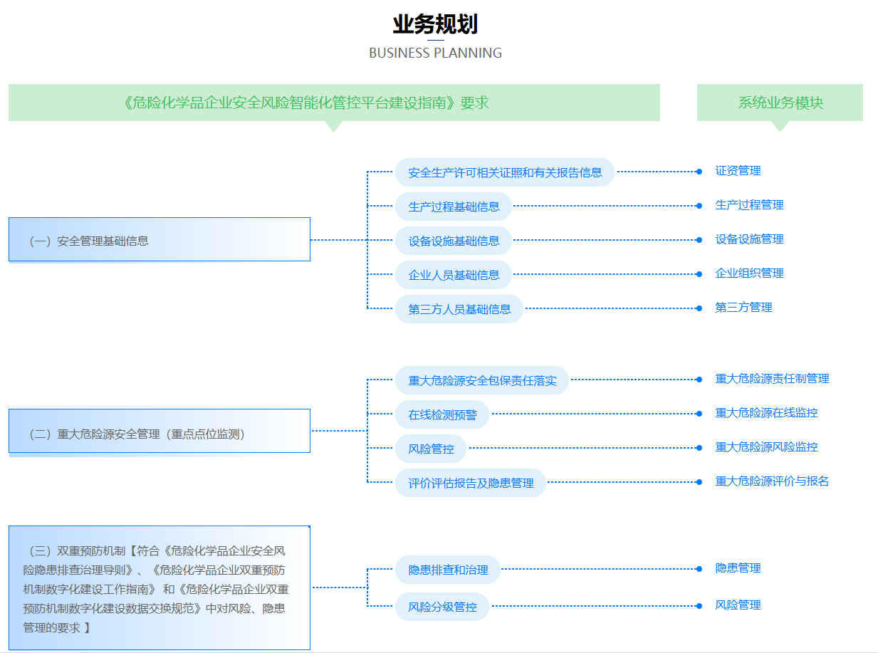 系统包含企业安全一张图、风险分级管控、风险四色图、隐患排查治理闭环管理、数据统计分析等模块,功能满足国家政策要求,预留数据接口,满足政府相关部门数据交互对接、可与第三方系统集成,避免形成数据孤岛。支持横向拓展及功能二次开发,满足企业长期使用要求,为企业安全保驾护航。