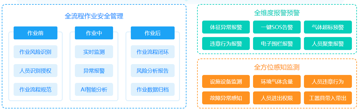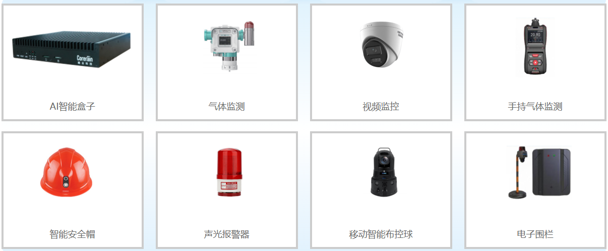 集成AI智能盒子、气体检测仪、智能安全帽、电子围栏等便携式智能硬件,通过边缘AI通讯终端和融合通讯基站,实现对 重点点位监测预警,支持对液位、温度、压力和可燃有毒气体浓度监测报警;支持对明火、烟雾、人员违章、劳动防护用品佩 戴不当等进行智能自动识别和预警,形成全方位感知监测、全维度报警预警、全流程作业安全智能管控。