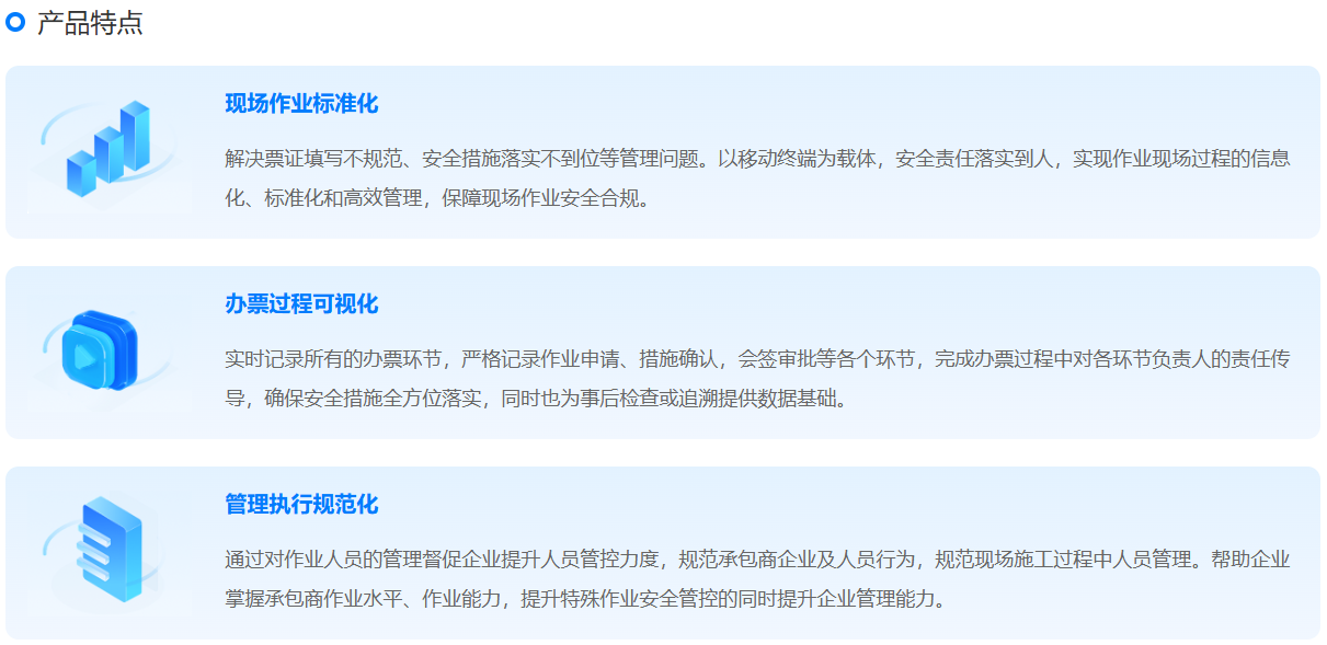 特殊作业系统包括电脑端(PC)和移动端(APP),实现了《化学品生产单位特殊作业安全规范》(GB30871)附录A中所列出的作业票全过程在线办理,实现了特殊作业审批许可条件条目化电子化、流程化,并通过信息化手段对作业全程进行过程和痕迹管理,从而实现特殊作业申请、预约、审查、安全条件确认、许可、监护、验收全流程信息化、规范化、程序化管理;支持实时查看特殊作业审批许可流程,支持对特殊作业不安全行为进行报警、预警,支持对特殊作业进行统计分析,支持记录现场监护人员和管理人员对特殊作业的监管意见,提高企业事故预防和风险管控能力。